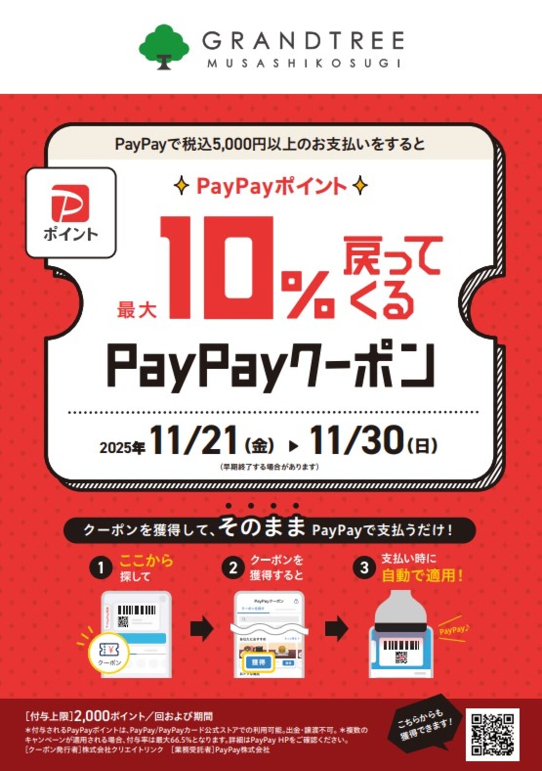 11/21(金)~11/30(日) グランツリー武蔵小杉の専門店対象店舗にてPayPayでお支払いいただくと