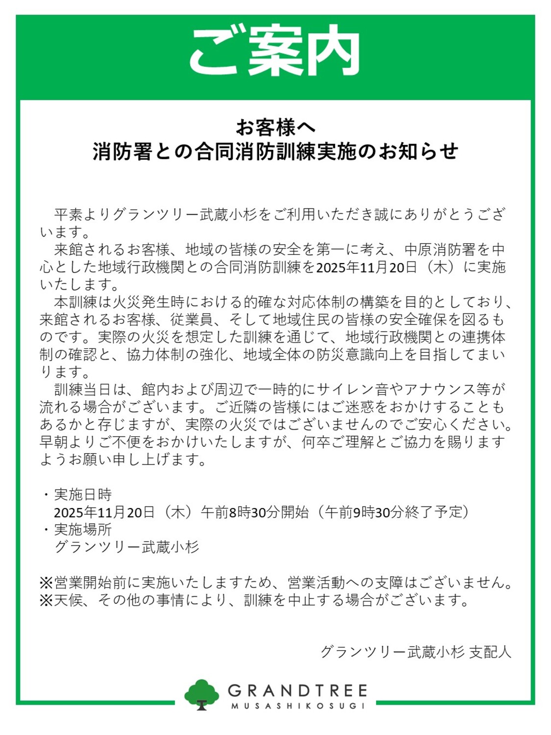 平素よりグランツリー武蔵小杉をご利用いただき誠にありがとうございます。
