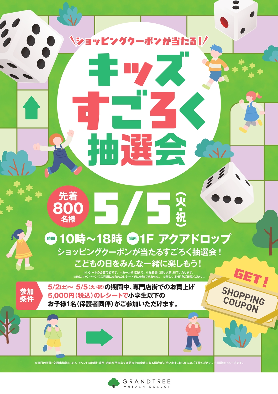 5/2(土)~5/5(火・祝)の期間中、専門店街でのお買上げ5,000円(税込)以上のレシートで小学生以下のお子様1名がご参加いただけます。