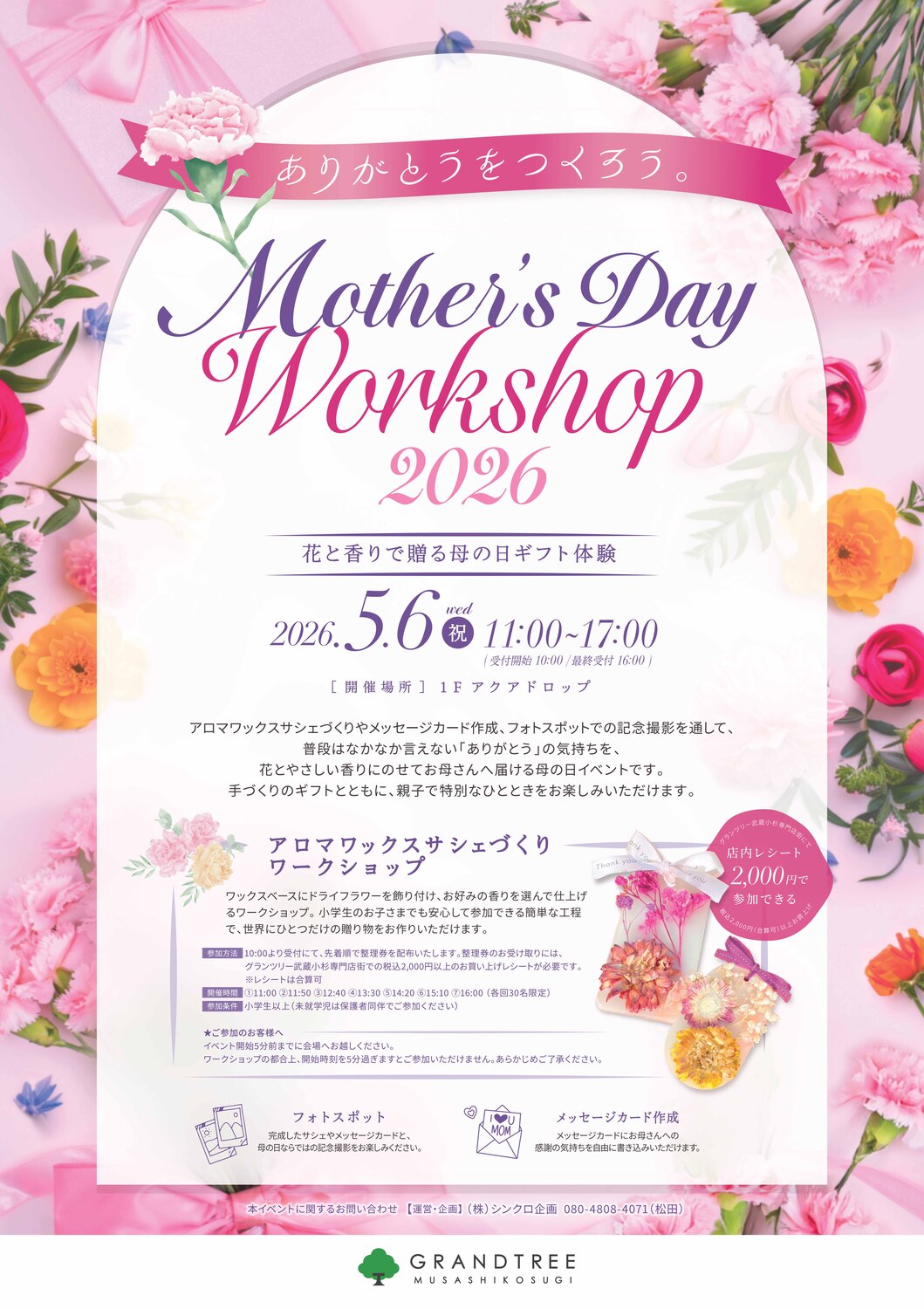 アロマワックスサシェづくりやメッセージカード作成、フォトスポットでの記念撮影を通して、普段はなかなか言えない「ありがとう」の気持ちを、花とやさしい香りにのせてお母さんへ届ける母の日イベントです。手づくりのギフトとともに、親子で特別なひとときをお楽しみいただけます。