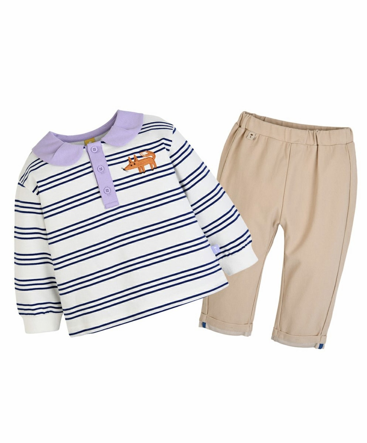 トップスの袖口はリブを使用、かわいいキツネのネロの刺繍や丸襟とボタン部分の配色使いでカジュアルながらもおしゃれ感もしっかり抑えています♪