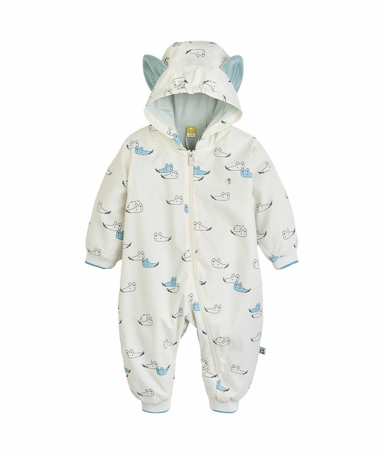 環境にやさしいリサイクル素材のカバーオール。ウィンドブレーカー(M253JMB03P)と同じキツネのネロやウサギのフォレが全体に描かれています。