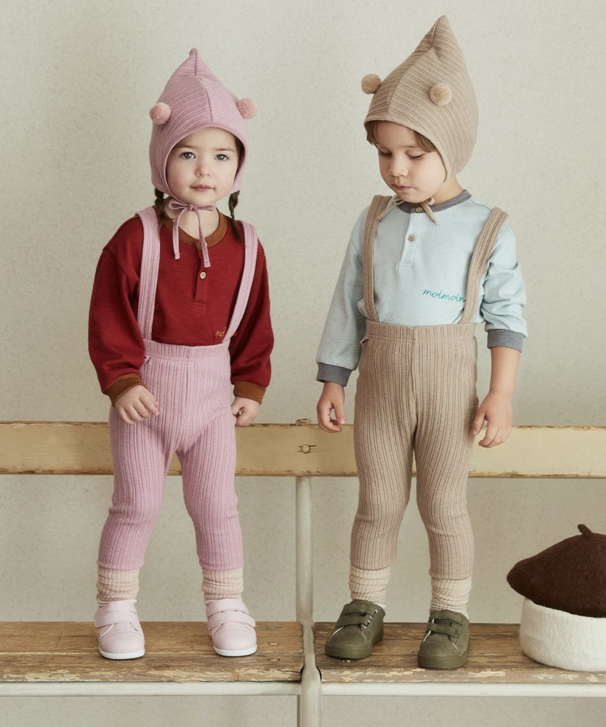 柔らかいジャカードリブ素材の伸縮性の高い肩紐付きリブレギンスと帽子のセット♪