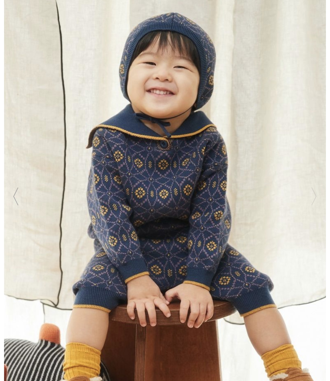 ネイビーにイエローの幾何学的な模様のパターンが目を引くニット素材のボンネット帽子。三角形スタイルのニット帽が着用時にきれいにフィットし、紐付きなので小さいお子様にも安心してお使いいただけます。【セットアップ】(M254STB04P)と一緒にコーディネートすると、妖精のようなかわいい感じになれちゃいます。