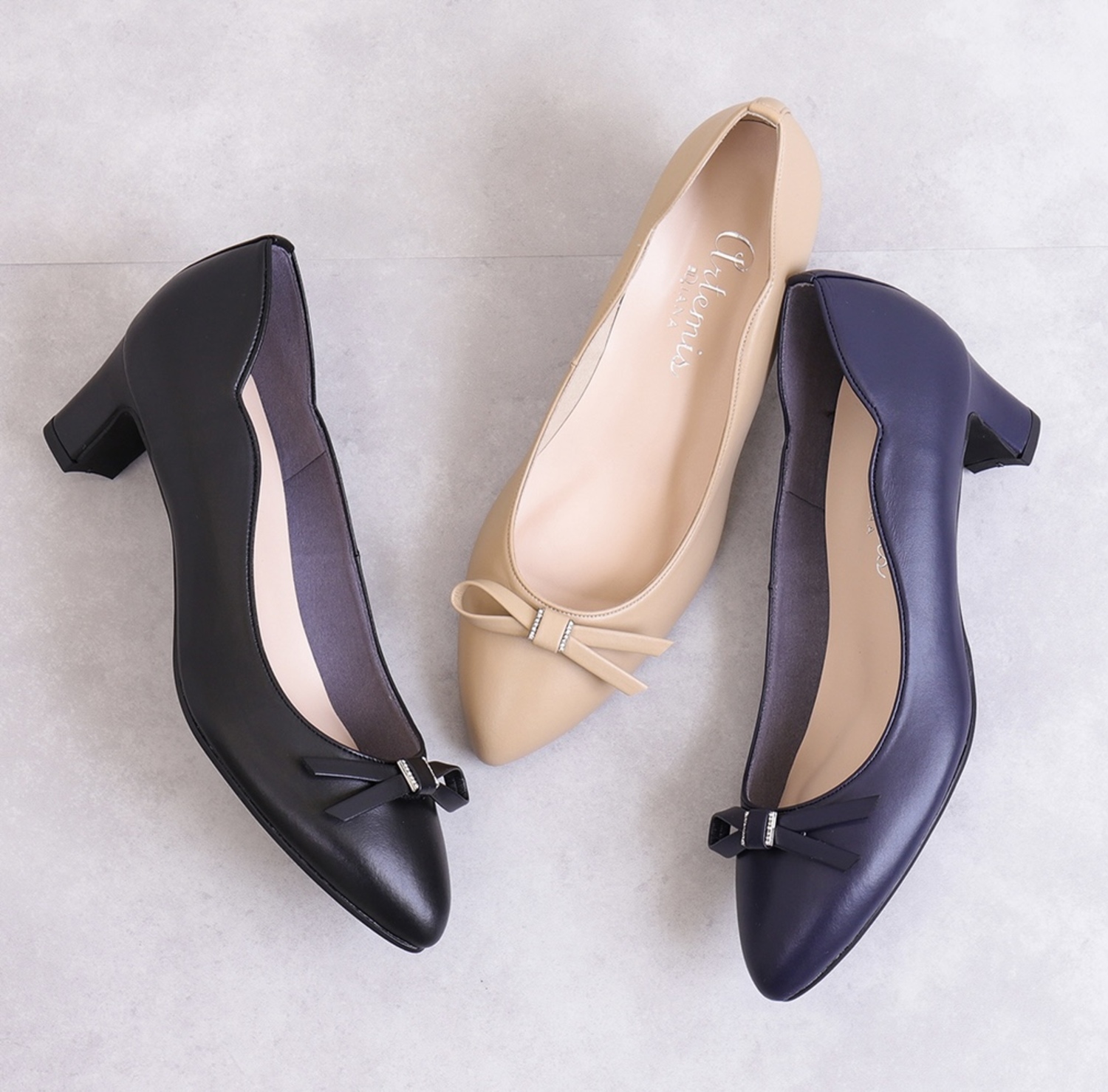 上品でシーンを選ばないカラー展開で、セレモニーやお祝いの席にもぴったりです!かかとのフラワーカットと、やや丸みを帯びた安定感のあるヒールでどこから見ても女性らしい雰囲気♪