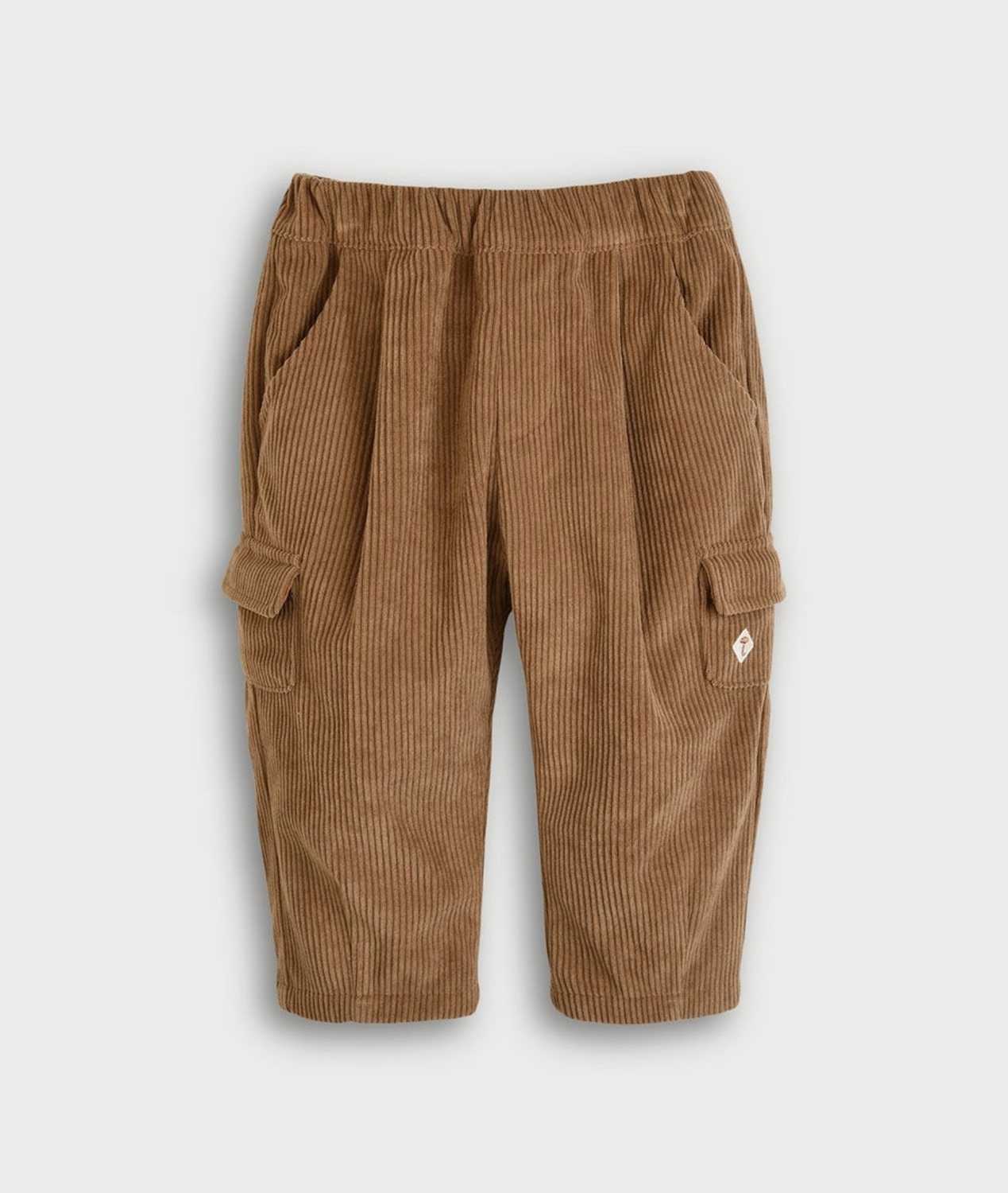 柔らかくウエストゴムで脱着もしやすいポリコーデュロイ素材のロング丈バギーパンツ。