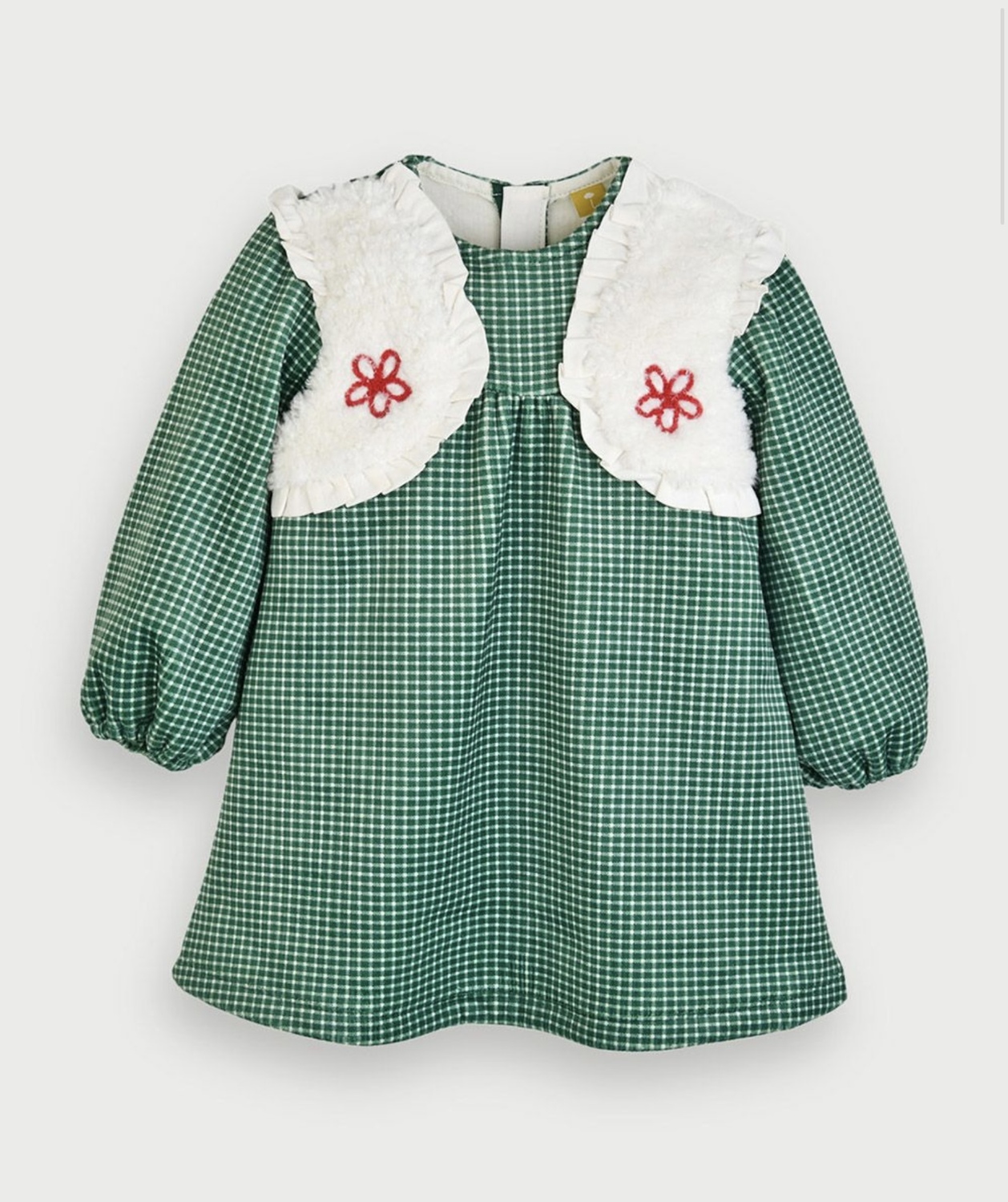 穏やかで高級な雰囲気のベロアのチェック柄長袖ワンピース。フリル付きのフェイクファーのショートベストをレイヤーしたようなデザインでかわいらしくキュートな仕上がり。グリーンのチェックベロアにレッドのフラワー刺繍をプラス、裏はソフト裏起毛でこれからの季節にぴったりのワンピース。背中はファスナーで脱着が簡単、ファスナーの内側にはファスナーガードを付け、肌への刺激を防止しています。クリスマスなどホリデーシーズンにもマッチしてくれ、レッドカラーのアクセサリーとコーディネートのおすすめです。