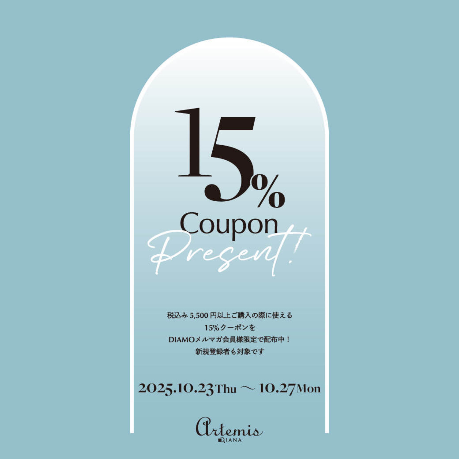 10月23日(木)〜10月27日(月)の5日間、DIAMO会員様限定で、¥5,500(税込)以上お買上げからご利用頂ける15%OFFクーポンをプレゼント致します!