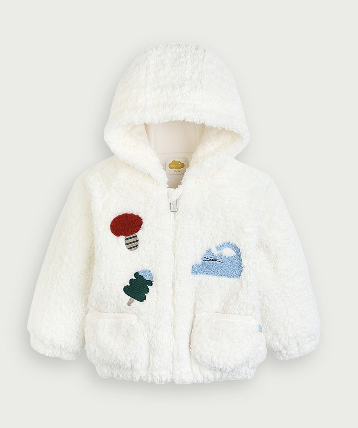 ネコのミャオ(meow)、きのこ、木のブクル刺繍のボアフリースジャケット。柔らかいボア生地に前はファスナーで脱着も簡単、ファスナーガードも付いているのでお子さまにも安心です。裏地まで柔らかいフリースで暖かく、フィット感を感じられるフード付きジャケットです♪