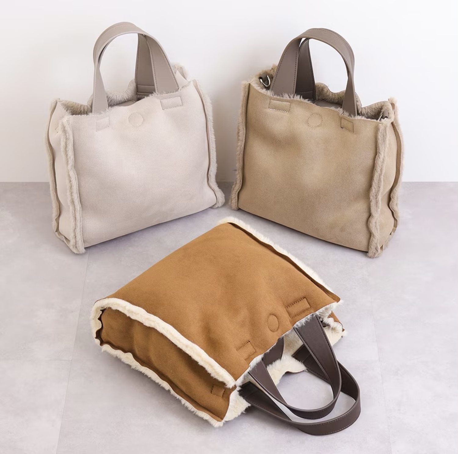 リバーシブルで使えるフェイクスエードとフェイクファーのコンビ。ショルダーベルトも付いていてその日の気分やスタイリングによって変えられるので、バッグを2個持っているようなお得感♪