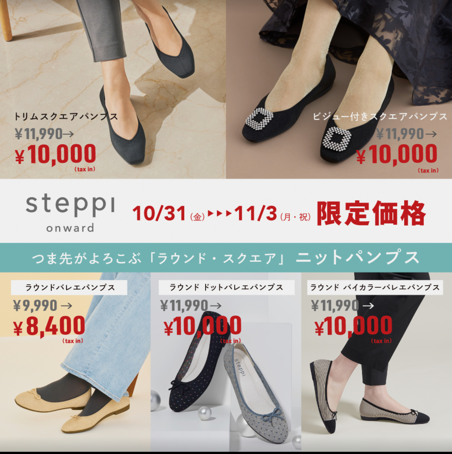 steppi「ラウンドバレエパンプス」「スクエアパンプス」シリーズが10/31(金)~11/3(月・祝)の期間、お買い得な限定価格に!