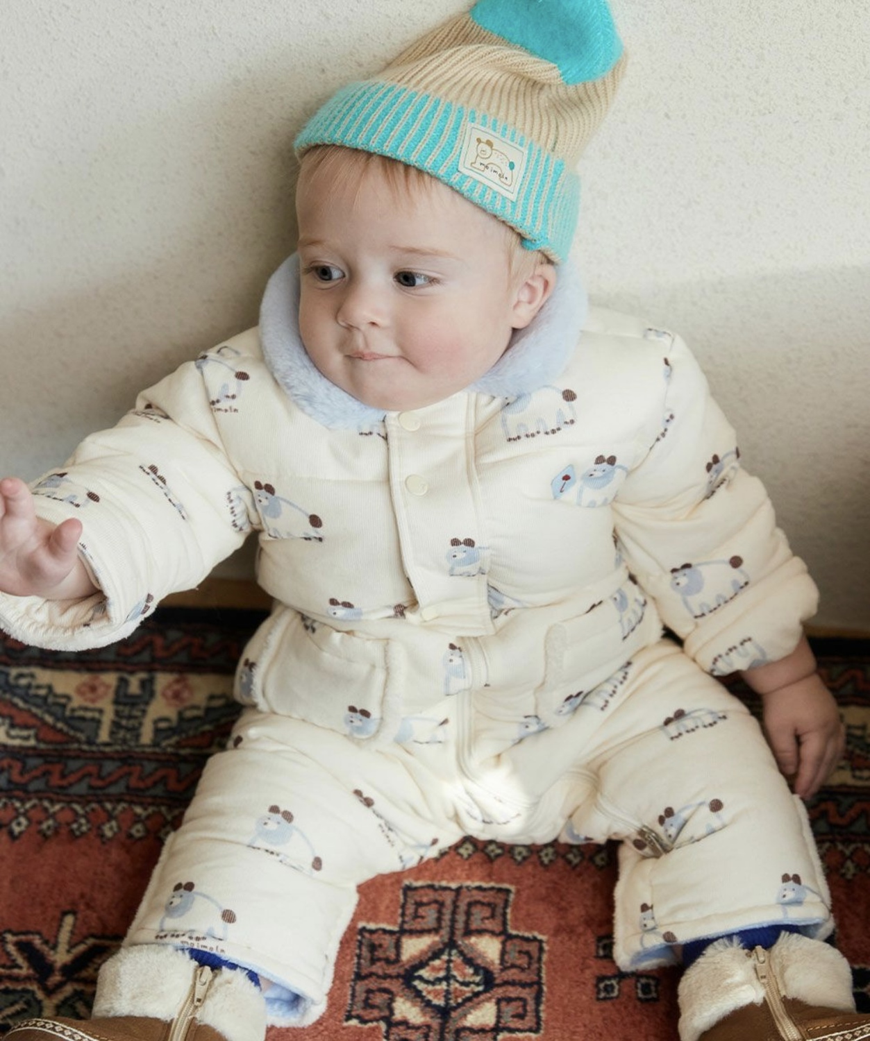 モイモルンだけのユニークなクマのデリック(derick)のプリント生地が柔らかいコーデュロイにプリントされたパデットカバーオール⭐︎