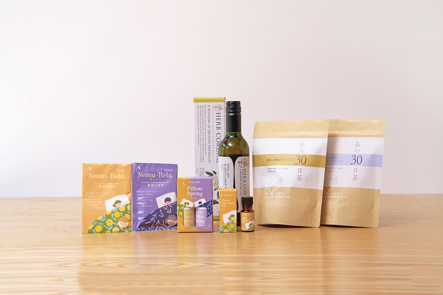 リラックスタイムにおすすめの香りのアイテムやブレンドハーブティー、人気のハーブコーディアルのセット。ピロースプレーと入浴剤はその日の気分で香りをお選びいただけます。