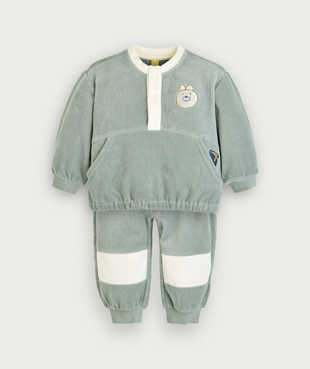 暖かいベロアリブ生地と柔らかい無地のベロア配色がポイントの長袖トップスとロングパンツのセット。トップスはスナップボタンで着脱でき、胸元のクマのデリック(derick)やポケットのハチミツ壺の刺繍がとってもCute、裾のさりげない絞りもデザイン性の高いディテールとしてプラスされています。パンツは膝部分での配色ディテールがポイントになっていて、カジュアルながらもモイモルンらしい遊び心がたっぷり入ったデザインです。保温性と快適さを両方備えた冬のデイリーウェアとしておすすめのセットアップです。