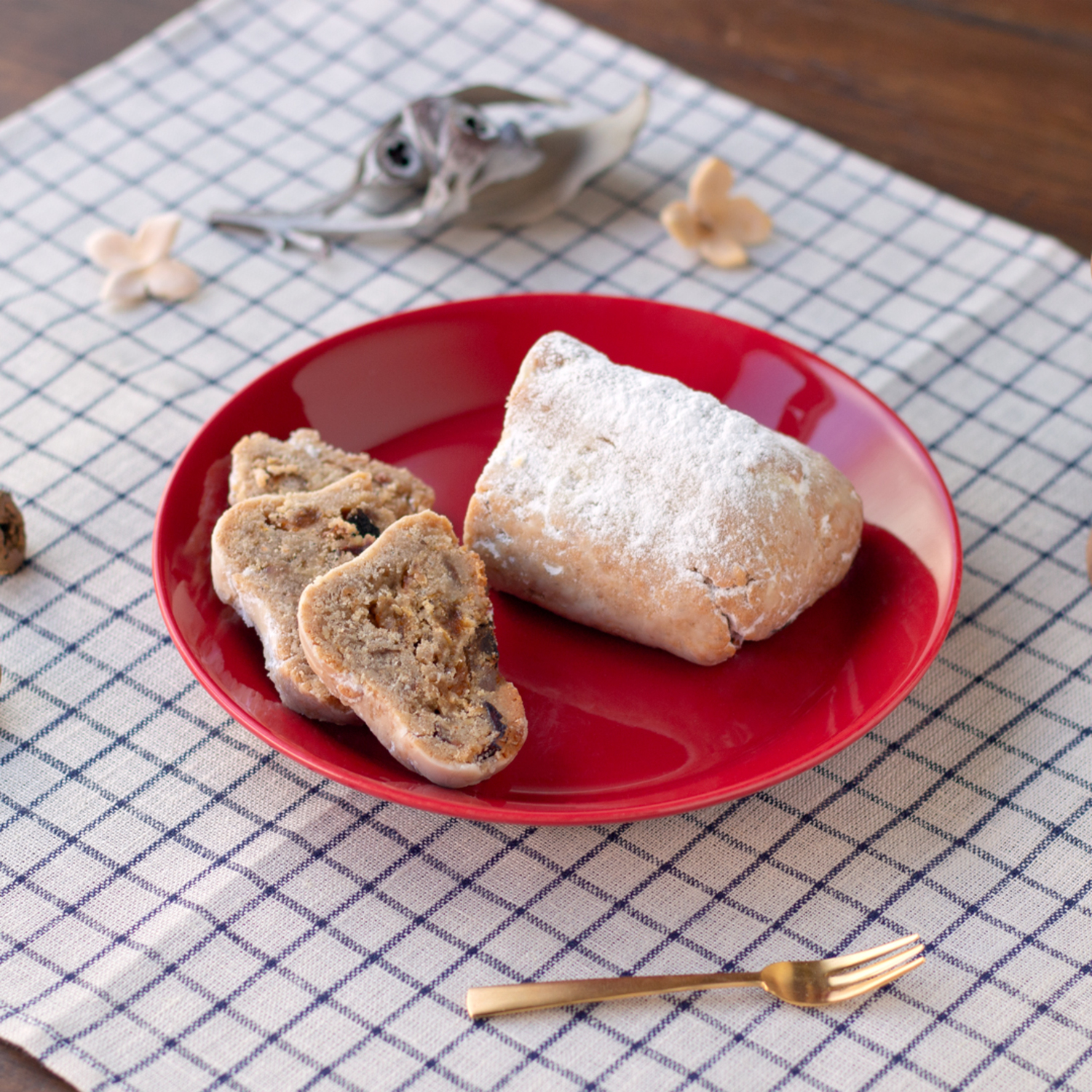 ブランデーなどに浸けておいたドライフルーツと、香ばしいナッツ、たっぷりのバターを一緒に練り込んで焼いたドイツの伝統菓子です。