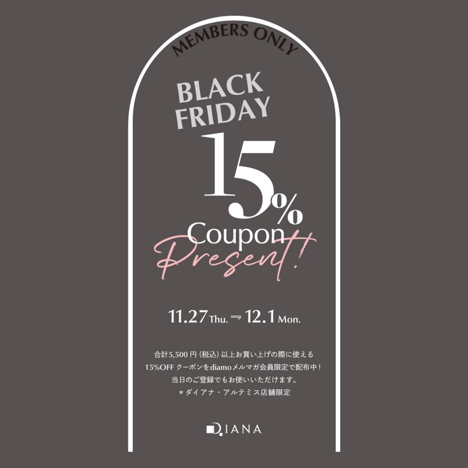 11月27日(木)〜12月01日(月)までの、5日間、DIAMO会員様限定¥5,500(税込)以上お買い上げでご利用頂けます!