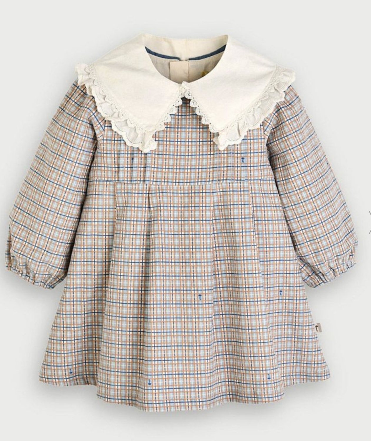穏やかで高級な雰囲気のコーデュロイ生地のチェック柄長袖ワンピース。ブルーの丸襟でも、取り外し可能なレース付きの襟でも気分によって替えられるのがポイント。裏地もしっかり付いていて、背中のファスナーで脱着も簡単、内側にガードを付け、肌への刺激を防止しています。特別な日にきちんとした服装で着やすくキャッツチェックカバーオールセット(M254ROB01P)、キャッツコーデュロイチェックシャツ(M254SHB02P)と兄妹ルックもぜひ。