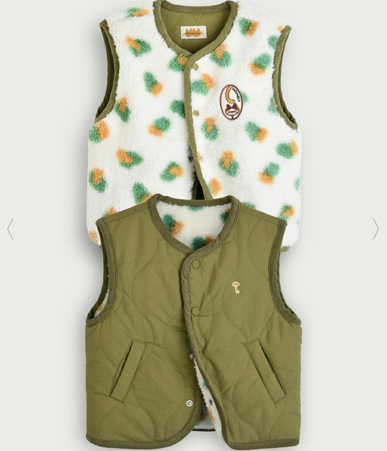 無地のナイロン側は、光沢感が感じられる曲線のようなキルティングディテールと暖かい コーデュロパイピング付き。両ポケット付きで、胸元のさりげないブランドマーク刺繍や、背中の首元にはネコたちのタグ付きです。