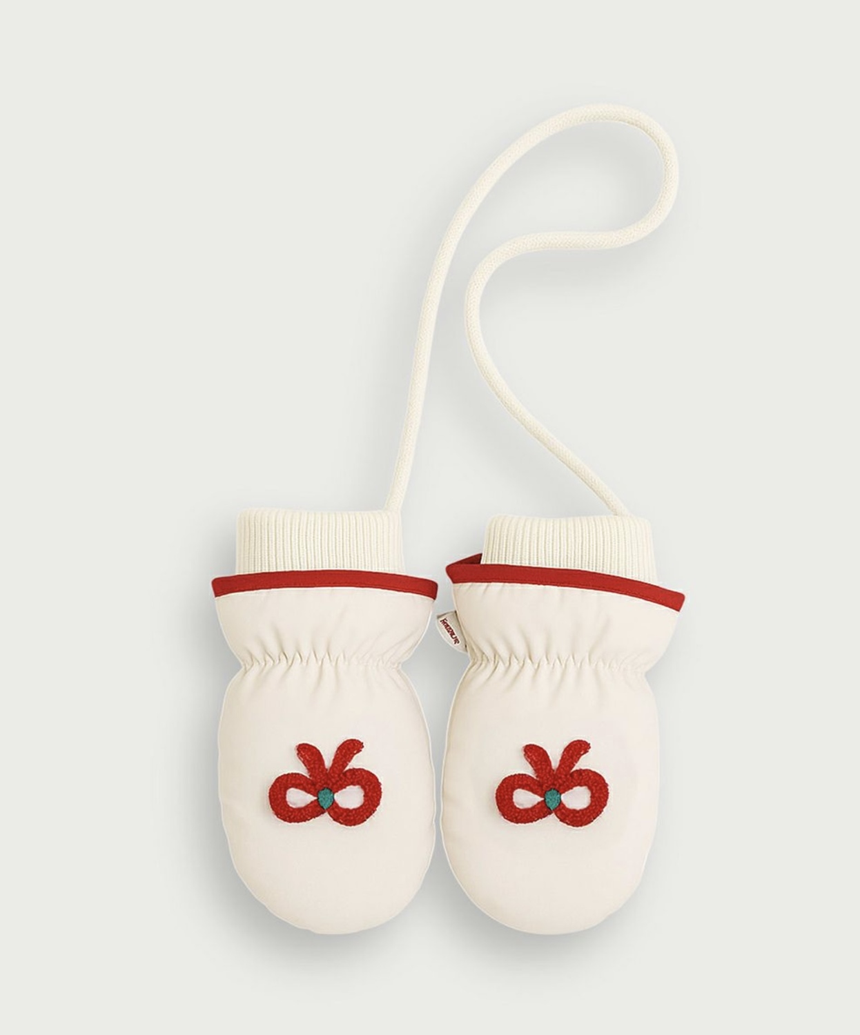 ソフトなアイボリーカラーに手首のレッドリボンのポイントで可愛らしさをプラスしたミトン。手首はリブを使用し、しっかり寒さを防止。手の平には滑り止めになる生地が付き、紛失防止のために紐が付いています。