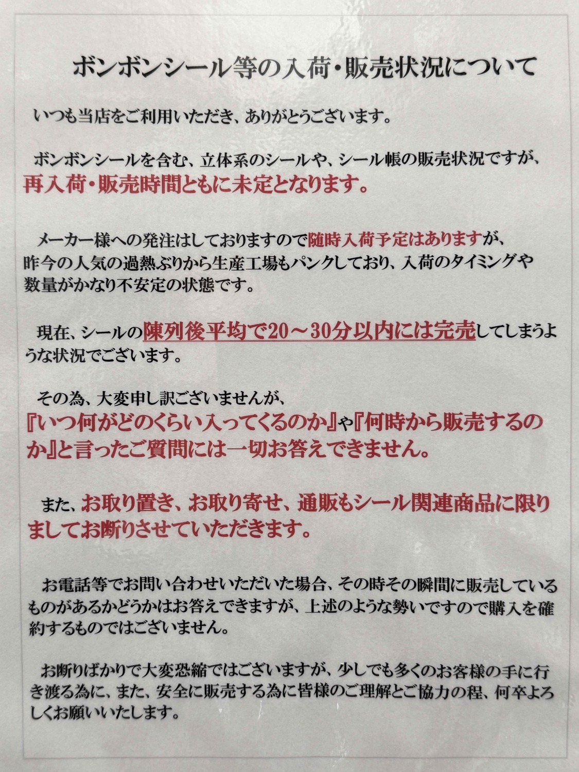 ボンボンシールを含む、立体系のシールやシールバインダーの販売に関して【レジでの販売】に変更いたしました。