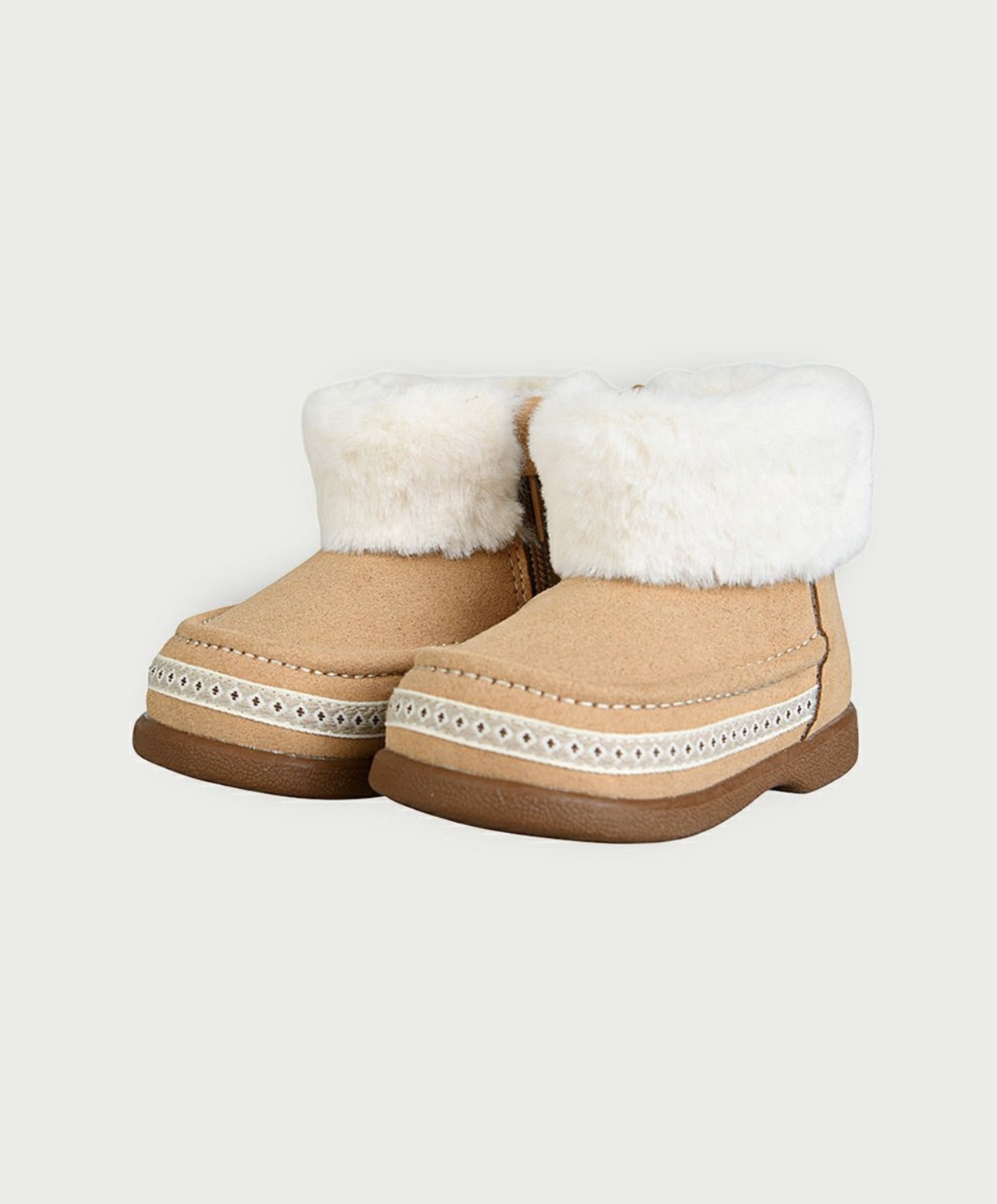 暖かいスエード素材のムートンブーツ型のメロディシューズ。足首にはファー、前からサイドに向けてチロリアンテープでのアクセントがポイント。さりげなくブランドマークの押し印入り。ブーツの内側には、ベルボアの裏地とライレックスのインソールで保温性にもこだわったアイテムです。