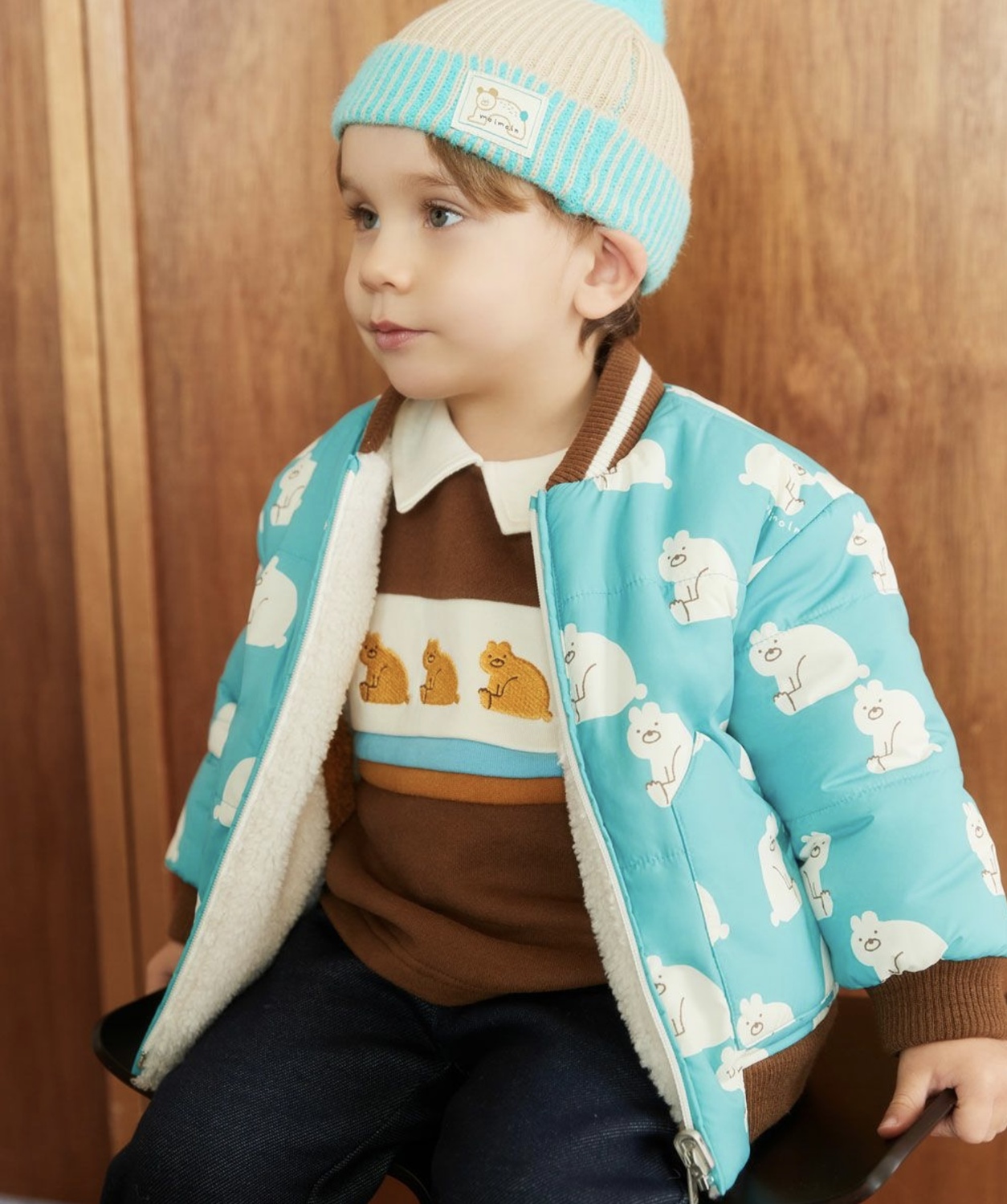 可愛いミントカラーにビックベアプリントにブラウンのコンビネーションがおしゃれなブルゾンと、ふんわりとしたボア素材に2色のカラー配色、胸元のクマ刺繍のワッペンがポイントになったブルゾンの2パターン。