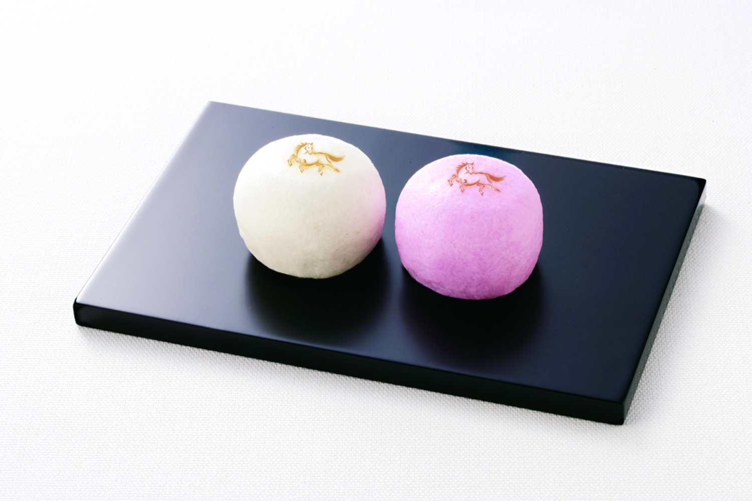 紅白の薯蕷饅頭に、2026年干支「午」の焼き印を施しました。
