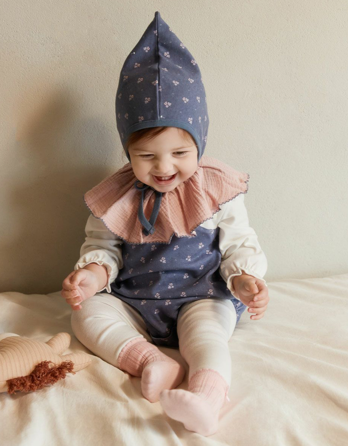 ピンクにネイビー配色がポイントのゴム入りスタイと、コーデしやすい無地のレギンス、同柄のひも付き帽子はボディスーツとコーディネートしても、バラバラでも活動度の高いアイテムです。