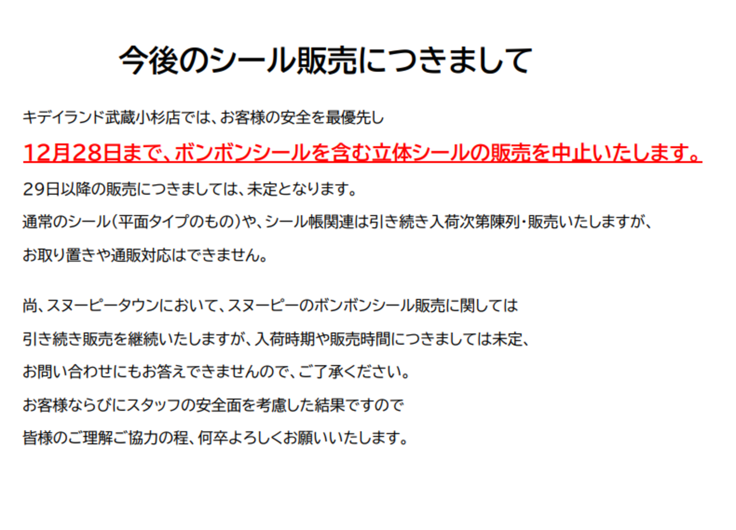 尚、スヌーピータウンにおいてスヌーピーのボンボンシール販売に関しては引き続き販売を継続いたしますが、