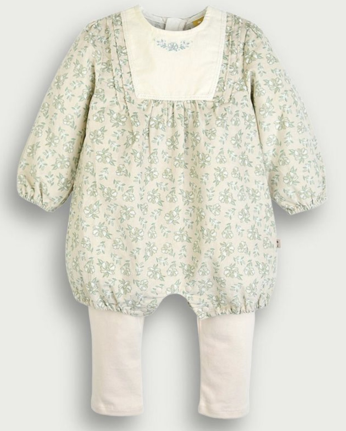 ベージュ×グリーンのフラワーパターンが愛らしいコーデュロイ素材のカバーオールとレギンスのセット。トップスは首元のフラワー刺繍とレースのテープ装飾でラブリーさをプラス、暖かくて伸縮性に優れたレギンスとセットになっていてこれからの季節にぴったりです。股部分はスナップボタン、背中はファスナーで脱着が簡単、ファスナーの内側にはファスナーガードを付け、肌への刺激を防止しています。