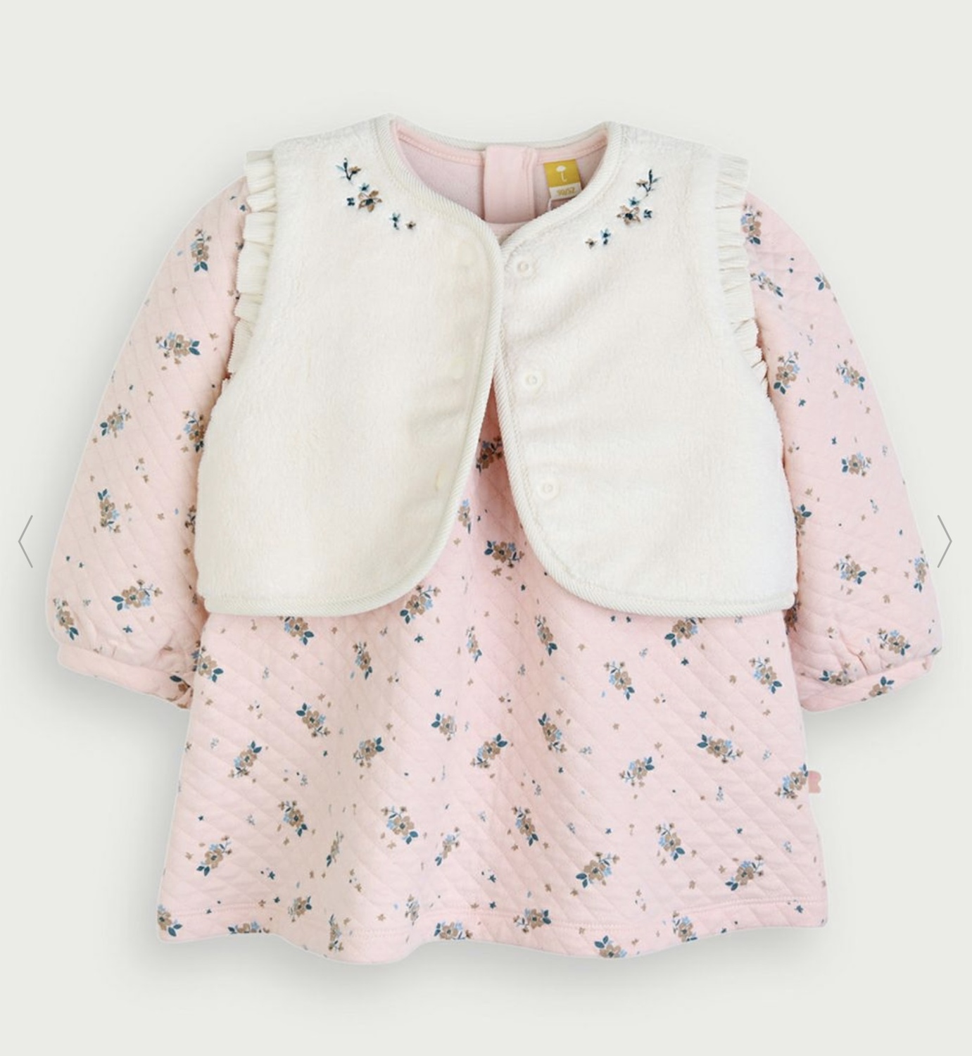 フラワーパターンの三重地長袖ワンピースとふんわりとしたフェイクファーベストの組み合わせのセット。