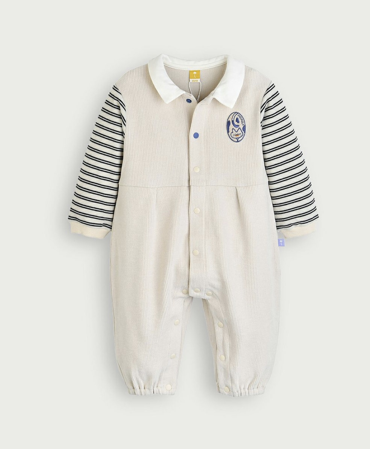 柔らかい起毛ジャカードの長袖カバーオール。ボーダー柄の袖との切替が重ね着風なのと、胸元のネコのミャオ(meow)刺繍や首元のスナップボタンをあえてブルーに統一したりとおしゃれ感漂うデザイン。パンツ部分はゆったりフィットなシルエットで、フロントから足先までスナップボタンで、脱ぎ着もスムーズです。