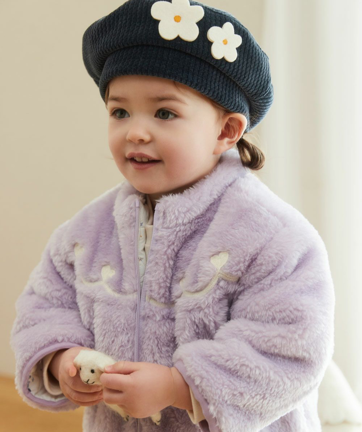 ボア側はラベンダーのワントーンにホワイトハートのブクルチェーン刺繍で高級感を加え、フラワー側は、ブルーの小花を全体にちりばめ、胸元にはさりげなくブランドロゴのパッチワッペン付き。