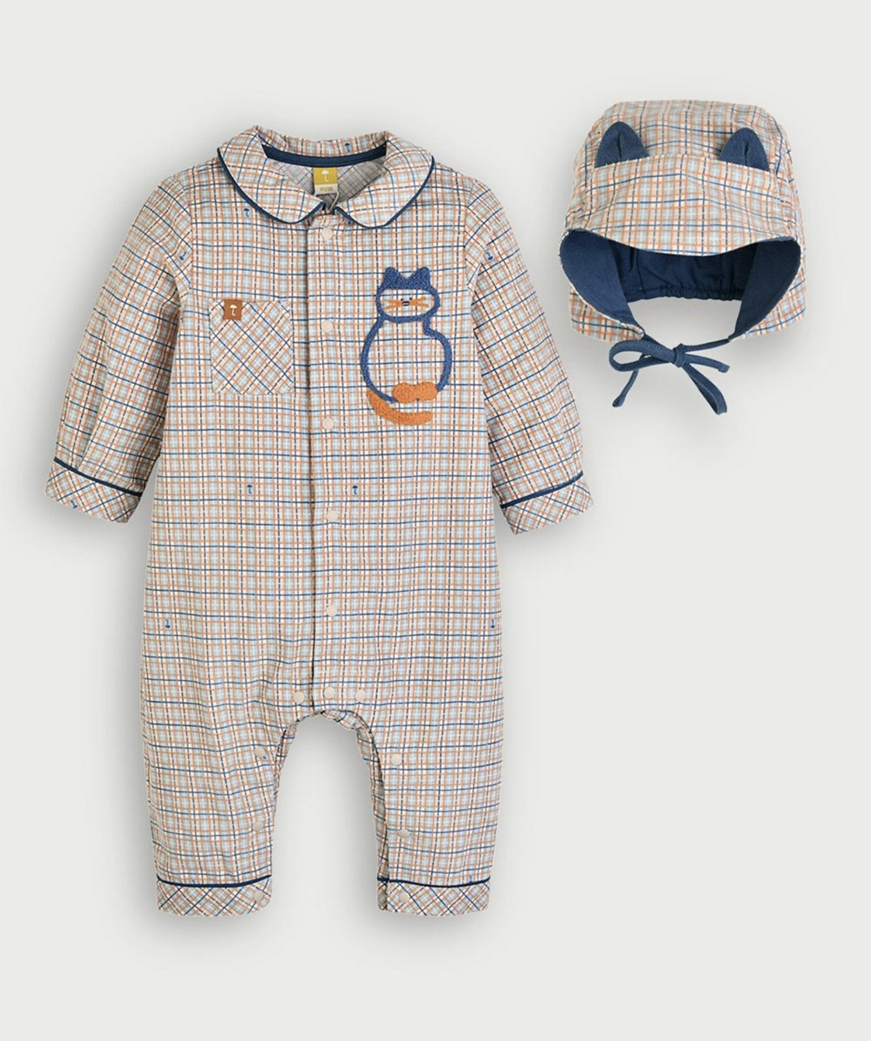 【2点セット】キャットチェック柄長袖カバーオール&帽子