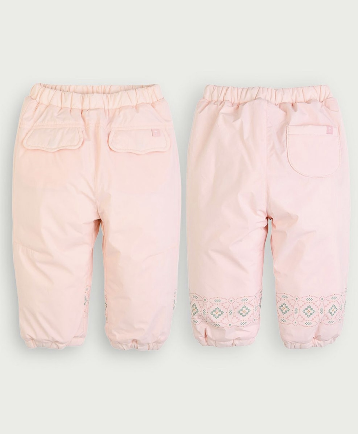 はっ水加工された生地でスキーなどのシーズンリゾートにぴったりなあったかパンツ。両サイドの変形アウトポケットにはブランドマークのミニタグ付きで、後ろの裾付近には今シーズンのモいモルンらしい柄をプリント、裏起毛の素材で寒い中外で元気に遊べる機能性パンツです。