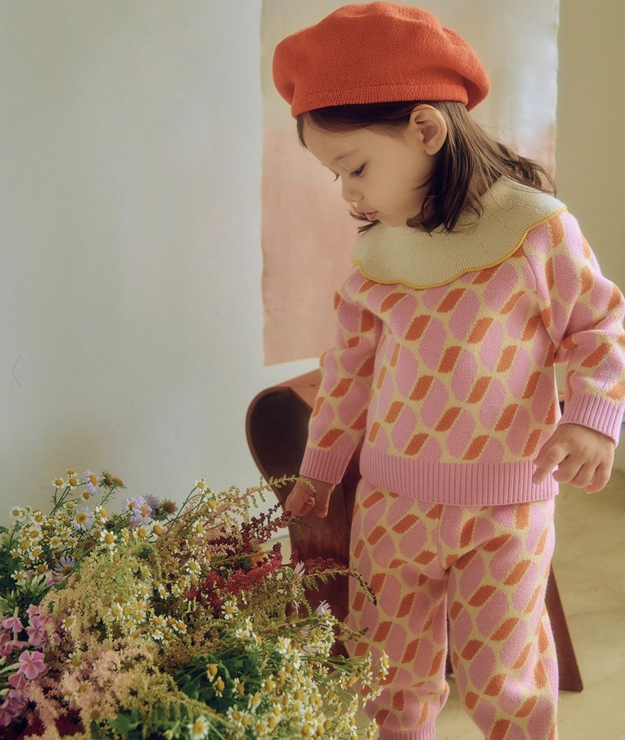 【セットアップ】幾何学柄長袖ピンクニットトップス&パンツ
