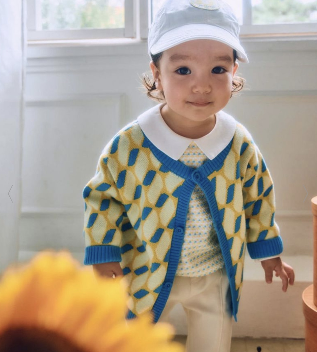 カラフルでユニークな幾何学図形のニットの長袖カーディガン。