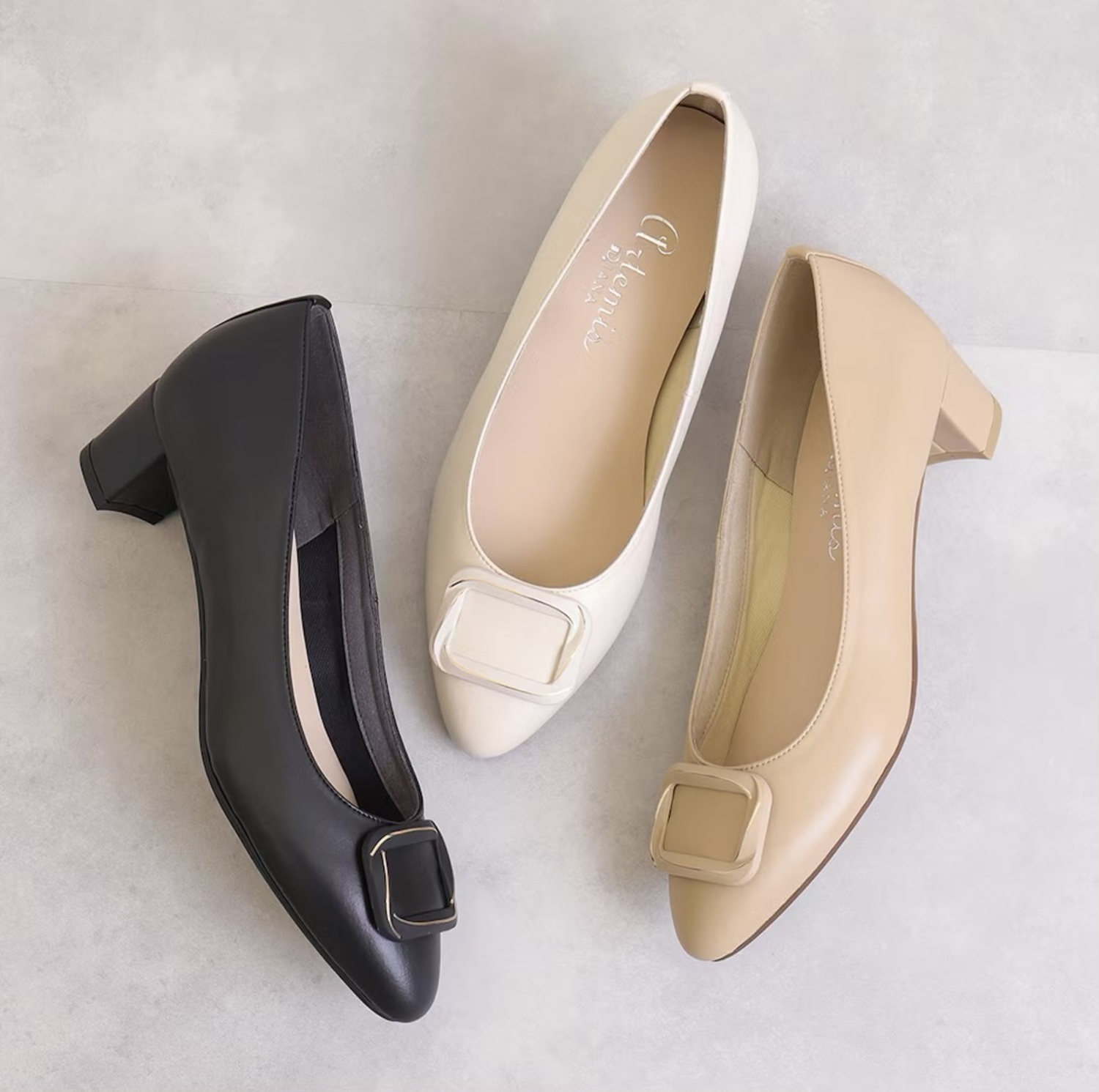 同系色で仕上げたバックルモチーフが、上品で優しい印象の足元に仕上がるパンプス♪