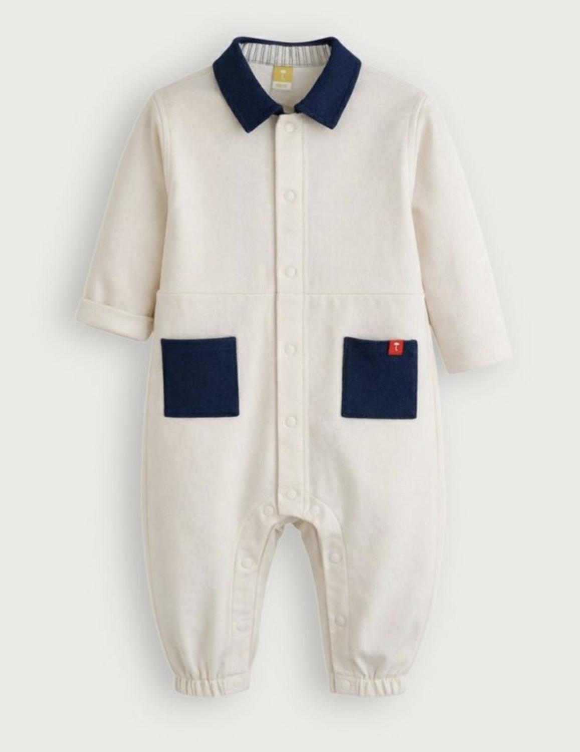 デニム風の襟やポケットなどがポイントの長袖カバーオール。