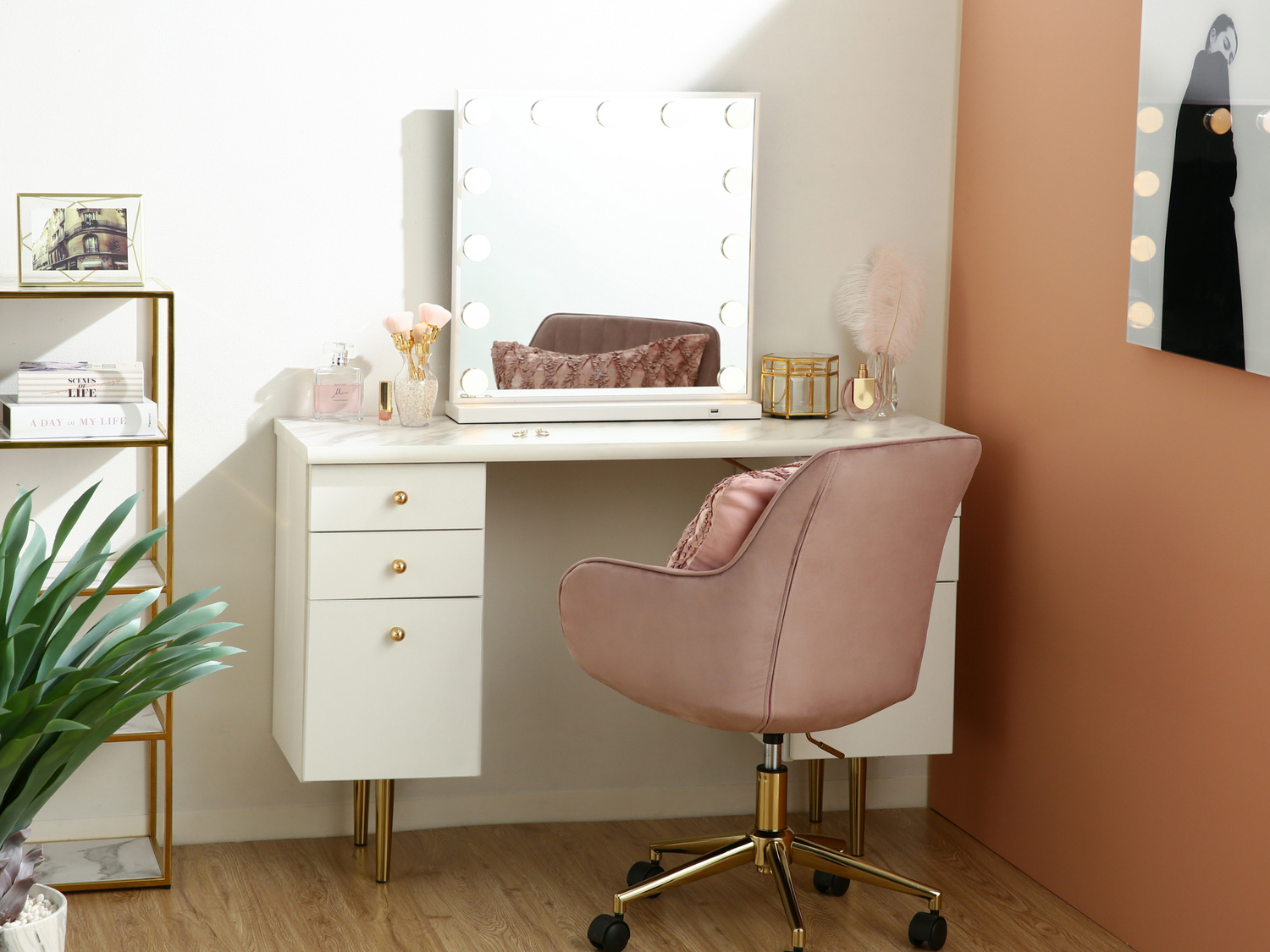 まるで女の子の憧れを形にしたような心ときめくコスメデスクです。洗練されたデザインと実用性を兼ね備えた理想的なドレッサーが、毎日のメイク時間を特別なひとときに変えてくれます。