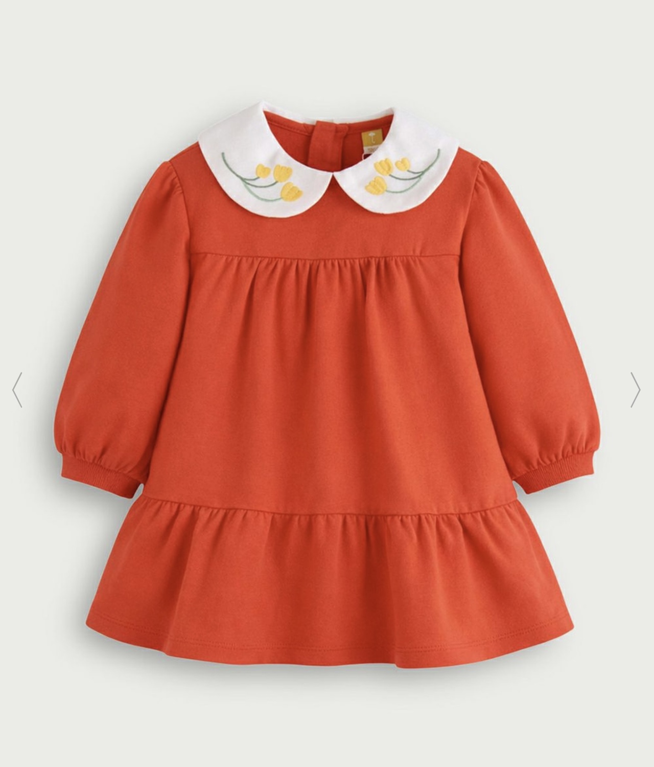 大きな丸襟にはイエローのチューリップ刺繍がアクセントに、袖口をリブにすることでふわっとした袖感をだしてくれラブリーな印象に。