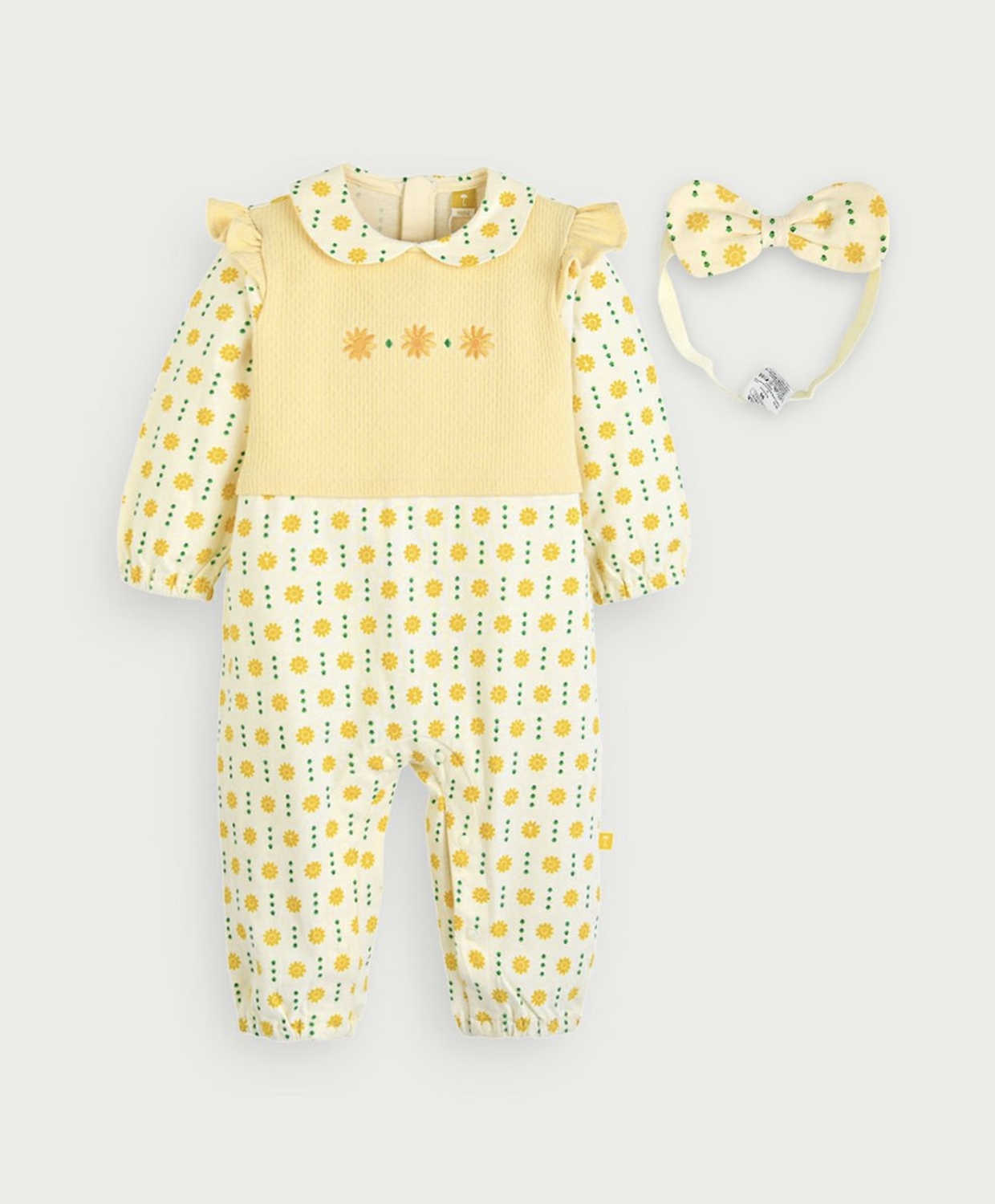 ポップで明るいフラワープリントのカバーオールとヘアバンドのセット。