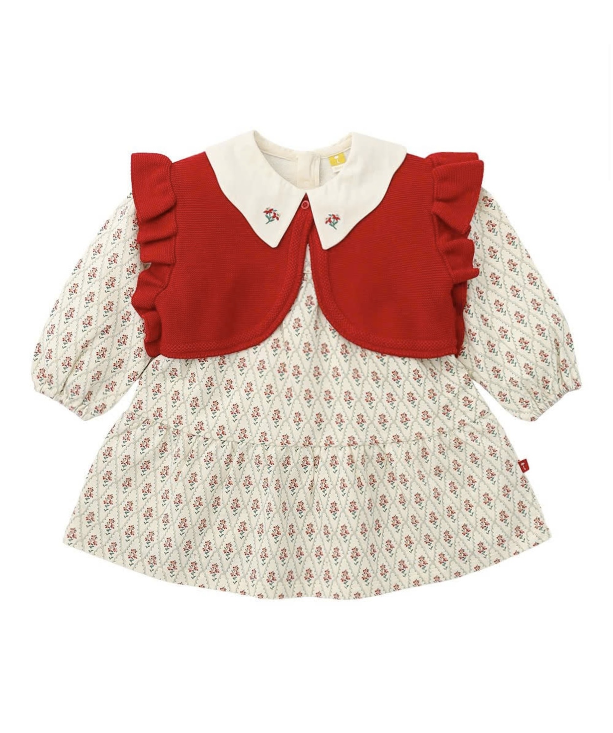 アームにフリルが付いたボレロ風ニットベストがセットで付いた総柄長袖ワンピース♡