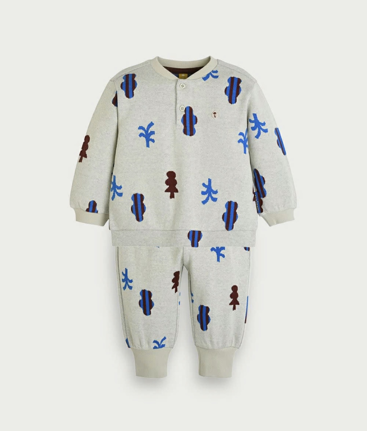 まるでカラフルな森をイメージした今シーズンの柄の長袖トップスとパンツのセット。