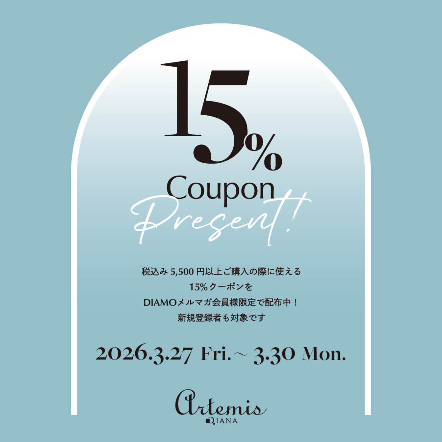 3/27(金)〜3/30(月)の4日間、 DIAMO会員様限定で¥5,500(税込)以上のお買い上げでご利用いただける15%offクーポンをプレゼント致します!