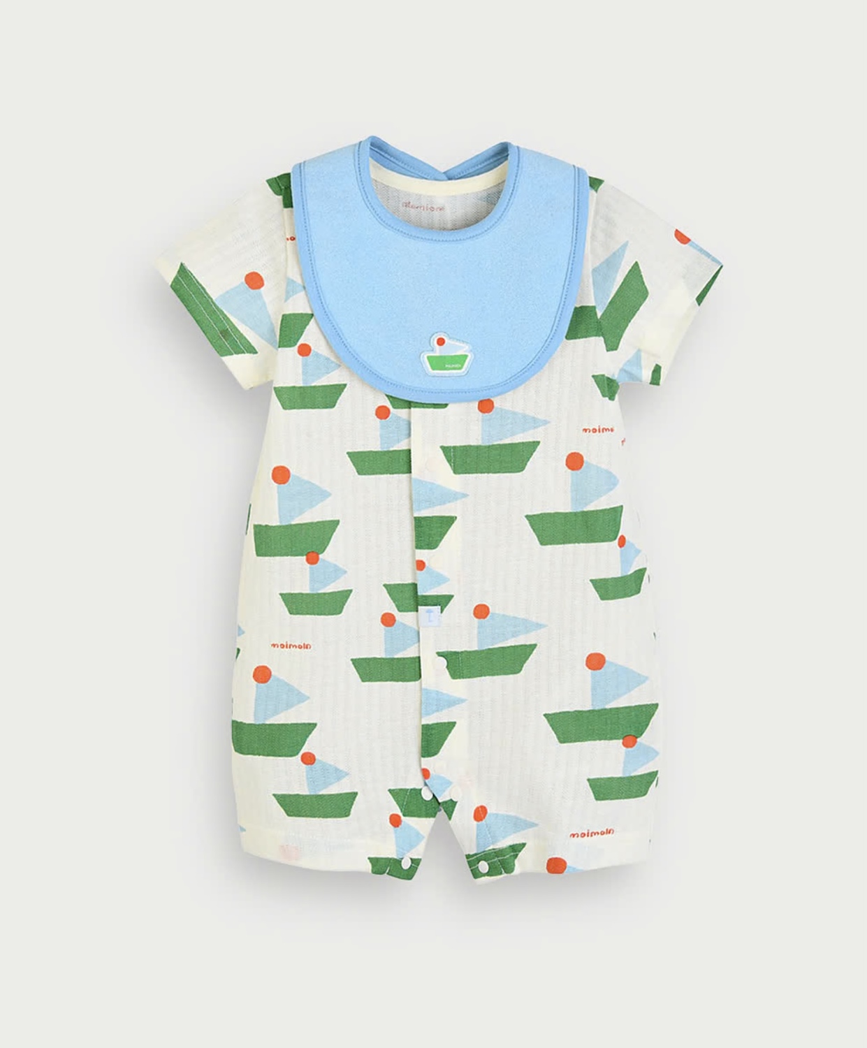 カラフルなボートが漕ぎ出され、楽しい雰囲気のある柄がポイントの半袖ロンパースとスタイの2点セット。