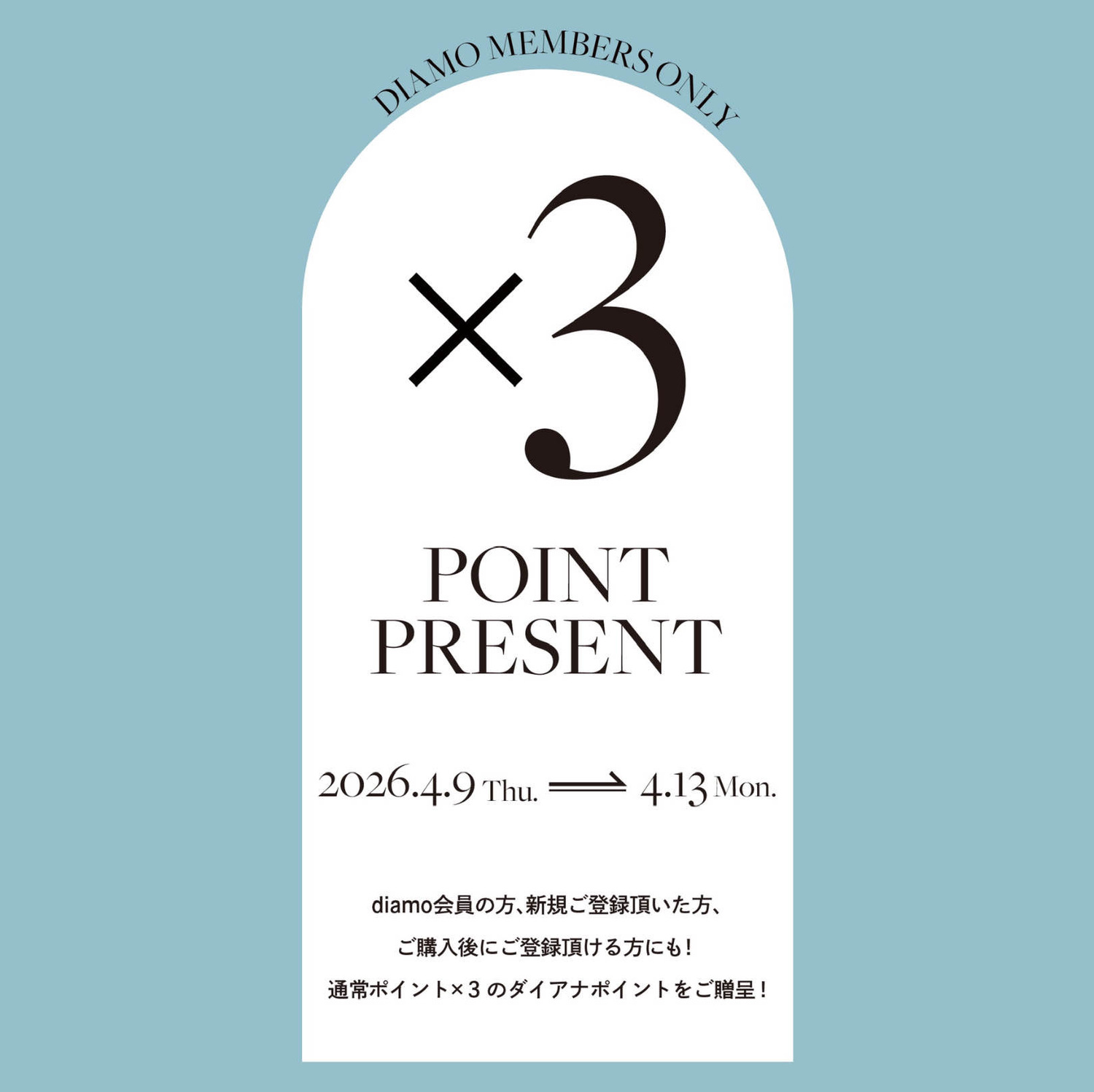 4/9(木)〜4/13(月)の5日間限定でDIAMO会員様限定3倍ポイントアップキャンペーンを開催致します!(通常3%→9%)