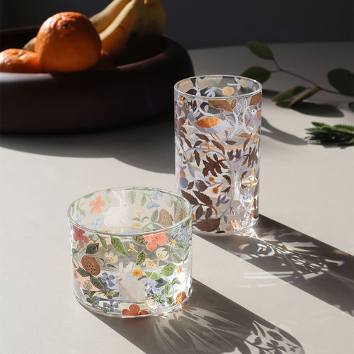 まるで自然の中にいるような、やさしい時間を感じさせてくれる耐熱グラス。涼しげなクリアガラスに落とし込まれた全面イラストは、落ちる影まで美しく食卓を華やかに彩ります。