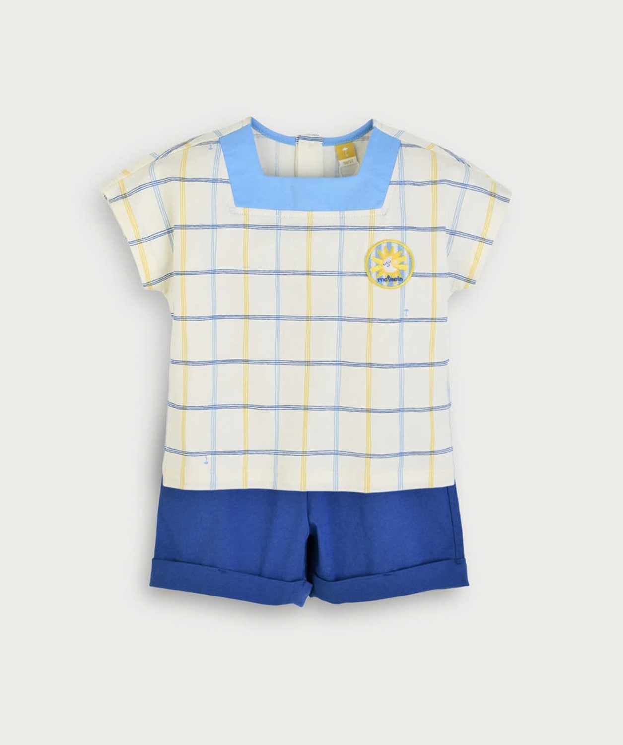 ユニークなチェック柄に、ネック部分の配色が涼しげな印象のフレンチスリーブトップスとパンツのセット⭐︎