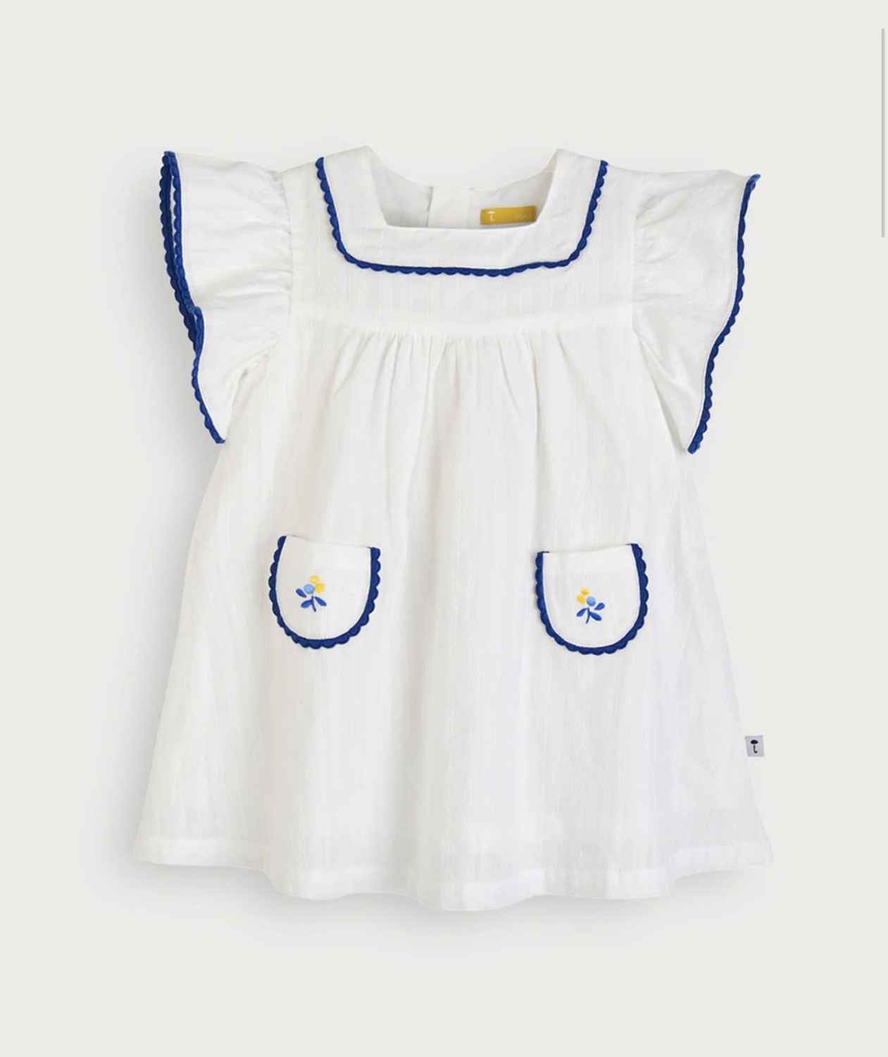 ブルーベリー刺繍やブルーのカラーパイピングがポイントのホワイトワンピース♡